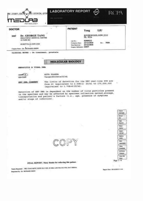 刘先生现在不但过去这么多的肿瘤与癌细胞一个都找不到了,而且连致癌症的病毒也没有了,附上医院给刘先生的医学报告,再一次证明卢台长的法门是殊胜的。