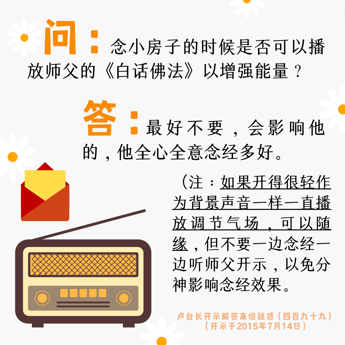 男听众:大量空白的小房子放在佛台下面的柜子里,是不是不好?台长答:那当然不好。你想想看,你整天把支票本放得这么厚,里边……人家就逼着你要等你拿钱了(还是得放在佛台以外的地方,是吗?)1000张以内应该没问题的,空白的,几百张都没问题。弄几千张在那里,你肯定出事了(谢谢师父)