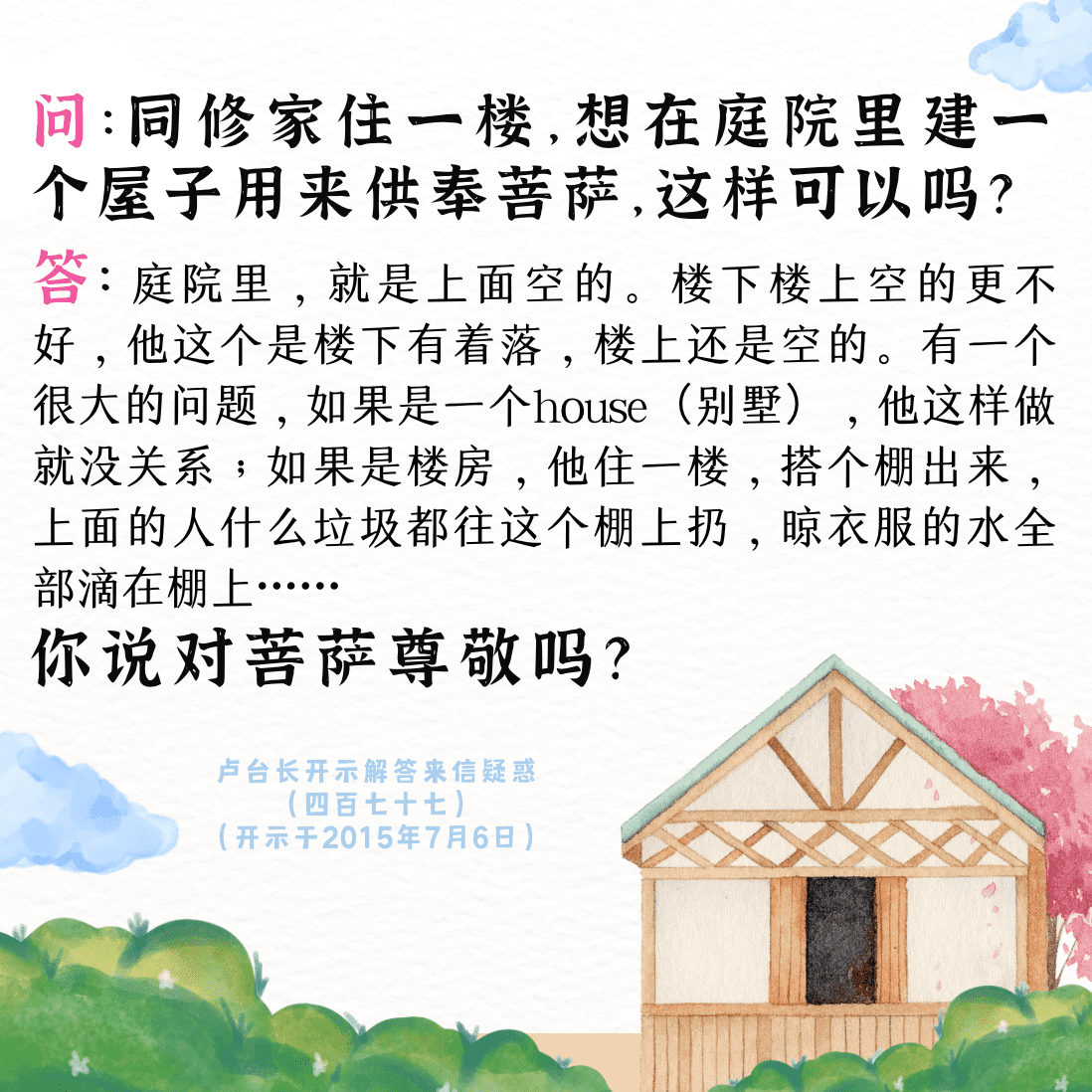 尊敬的同修您好!1. 建议加强小房子,注意质量。